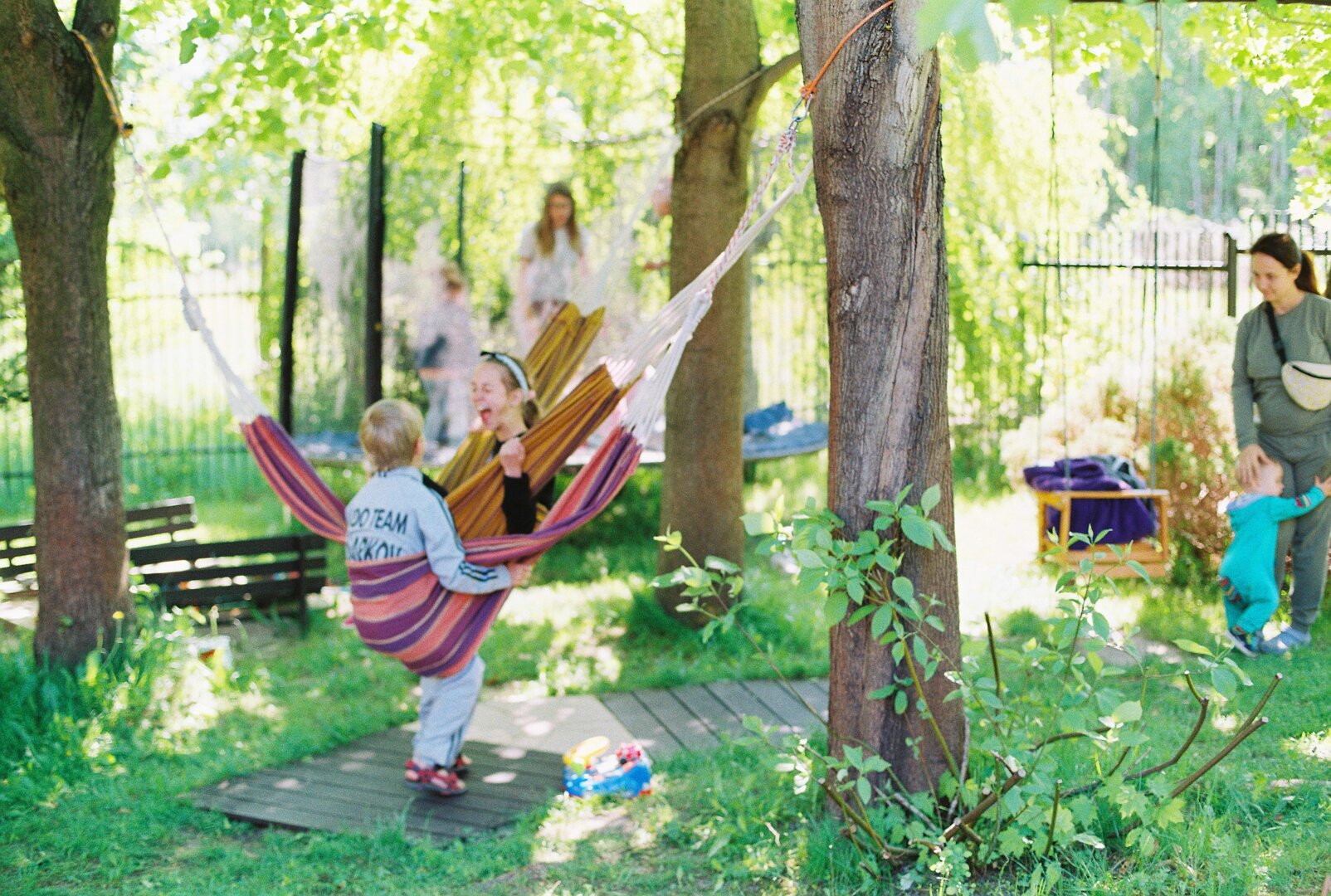 - plac zabaw: zjeżdżalnia, trampolina, piaskownica, huśtawka, dwa hamaki